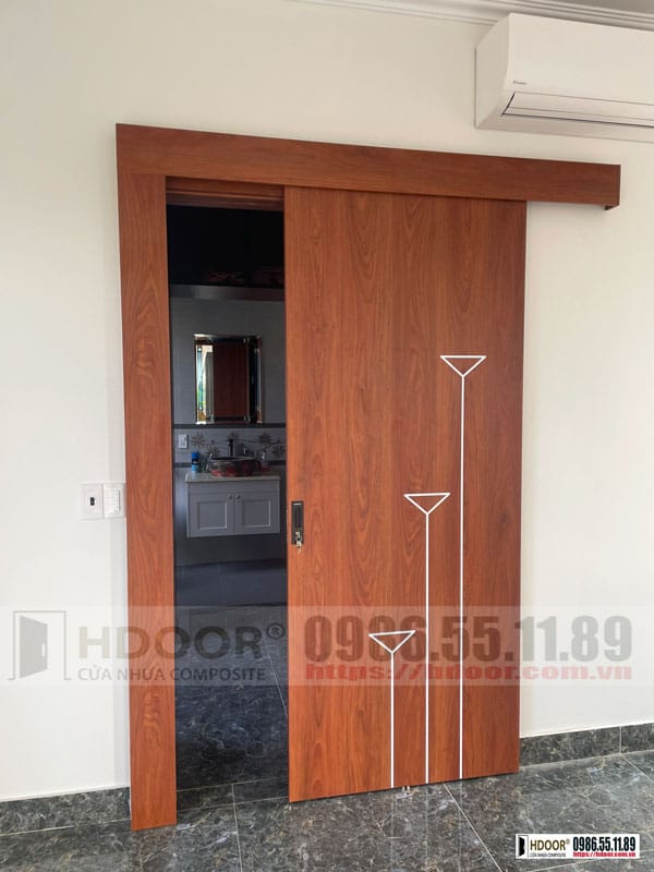 - Là mẫu cửa nhựa composite vân gỗ lim tạo kiểu chỉ sơn trắng, cửa lùa ray treo trên.