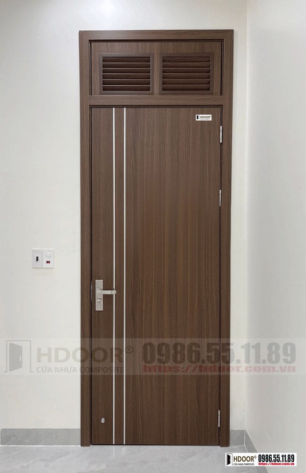 - Là mẫu cửa nhựa composite ô fix với chiều cao cửa >2m45. Toàn bộ cửa phủ film PVC vân gỗ óc chó, ô fix chớp 2 ô đồng màu với cửa.
